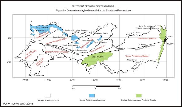 Figura 8 Localizado na região centro–noroeste, nos limites com os estados da Paraíba e Ceará, encontra-se limitado, tectonicamente, pelo Lineamento Pernambuco, ao sul, pelo Terreno Piancó/AltoBrígida, a oeste e pelo Terreno Alto Pajeú, a leste. No seu conjunto inclui unidades que vão desde o Arqueano até o Cambriano (Figuras 6, 7 e 8). Figura 7 Acha-se localizado na porção centro-norte do estado, tendo como limites o Terreno Piancó/Alto Brígida, a oeste, o Terreno Alto Moxotó, a leste e a sul. Na sua estratigrafia são reconhecidas litotipos datados do Paleoproterozóico a Cambriano (Figuras 6, 7 e 8). Localiza-se na região centro-norte de Pernambuco, se estendendo, a partir daí, na direção SW até a porção centro-sul, onde sofre uma inflexão e um estreitamento em direção à região centro-oeste. Tectonicamente é limitado, ao sul, pelo Lineamento Pernambuco e ao norte e a leste pelos terrenos Alto Pajeú e Rio Capibaribe, respectivamente. Estratigraficamente inclui unidades que vão do Arqueano ao Cambriano, além das coberturas cenozóicas (Figuras 6, 7 e 8). Se desenvolve na porção nordeste do estado, tendo por limite o Lineamento Pernambuco, ao sul, a Bacia Sedimentar Pernambuco Paraíba, a leste e o Terreno Alto Moxotó, a oeste. Inclui, no seu arcabouço estratigráfico, as unidades datadas do Paleoproterozóico ao Cambriano, como também coberturas cenozóicas (Figuras 6, 7 e 8). II.1.1.2 – Terrenos do Domínio Externo O Domínio Externo, localizado ao sul do Lineamento Pernambuco, inclui os terrenos Riacho do Pontal e Pernambuco/Alagoas, estando este último subdividido em dois segmentos : Leste e Oeste. Também conhecido como Batólito Pernambuco/Alagoas (Sobral e Ritcher, in Schaller, 1969), Maciço de Itaíba (Santos,1971), Maciço Pernambuco/Alagoas (Brito Neves, 1975) e Área Cratogênica de Pernambuco (Mello et al., 1977), este terreno se estende, na direção E-W, desde a região litorânea até a região sul do município de Parnamirim, no oeste pernambucano. Na porção leste o seu limite norte é balizado pelo Lineamento Pernambuco ou pelo Batólito Granítico de Caruaru, enquanto que a leste e ao sul tem como limite as unidades sedimentares das bacias costeira e as unidades do Sistema de Dobramento Sergipano, respectivamente. Na sua porção mais a oeste limita-se ao norte com o Lineamento Pernambuco, ao sul com o Craton do São Francisco e a oeste com o Terreno Riacho do Pontal, estando estes limites bem marcados por zonas de cisalhamento transcorrentes. Abriga, no seu interior, unidades lito-estratigraficas datadas do Paleomesozóico ao Cambriano (Figuras 6, 7 e 8). Encontra-se instalado no extremo sudoeste de Pernambuco, na região limítrofe com os estados do Piauí e Bahia, tendo como limite o Terreno Pernambuco/Alagoas, a leste, o Lineamento Pernambuco, ao norte e o Craton do São Francisco, ao sul. Inclui litotipos do Mesoproterozóico ao Cambriano, além das coberturas Cenozóicas (Figuras 7 e 8). II. 1. 2 – Província São Francisco No Estado de Pernambuco as unidades representativas desta província ocorrem restritamente na região de Petrolina, sendo caracterizada, segundo Brito Neves (1975), pela presença de um embasamento migmatítico granitóide, em cujas depressões se depositaram sedimentos clásticos finos, argilosos, siltosos e arenosos, onde podem ser observadas as estruturas sedimentares primárias.Todo este conjunto sedimentar foi reunido sob a denominação de Bacia de Barra Bonita. Segundo Gomes et al. (2001), o Craton do São Francisco se desenvolve no sudoeste de Pernambuco (limite com a Bahia), ocupando uma área bem maior do que aquela sugerida por Brito Neves (1975). Tem como limites: o Terreno Pernambuco/Alagoas, ao norte, o Rio São Francisco, ao sul e o Terreno Riacho do Pontal, a oeste. Na sua estratigrafia são reconhecidas unidades datadas desde o Arqueano até o Cambriano (Figuras 6 e 8). II. 1. 3 – Província Costeira e Continental Marginal Se estende por toda a faixa litorânea nordestina, bordejando a Província Borborema, onde se encontram instaladas as bacias sedimentares de Barreirinhas (Maranhão), Potiguar (Ceará e Rio Grande do Norte), Sergipe-Alagoas e, finalmente, a Faixa Sedimentar Costeira Pernambuco-Paraíba. No Estado da Bahia, sofre uma inflexão para norte, desenvolvendo-se aí as bacias do Recôncavo, Tucano e Jatobá, das quais apenas a última se encontra presente no Estado de Pernambuco. |